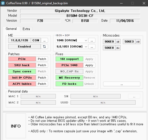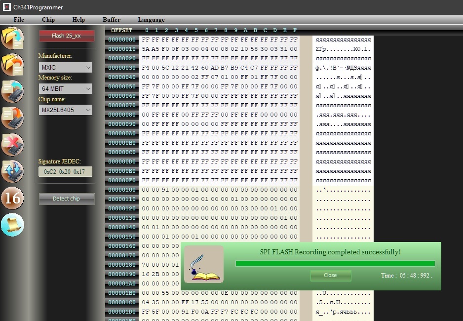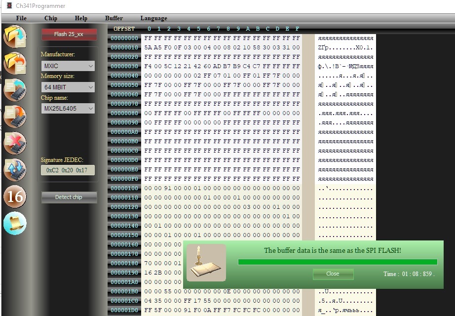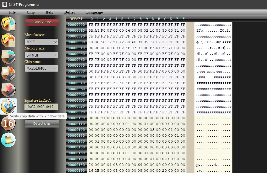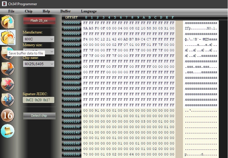 다 읽었다면 (1분 정도 걸림) 좌측 중상단의 Save buffer data to file을 선택해서 읽은 바이오스를 파일로 저장합니다.