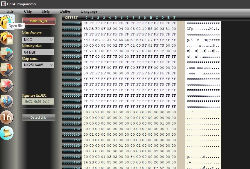 성공적으로 지웠다면 좌측 상단의 open file을 선택해서 롬에 저장할 바이오스 파일을 읽어줍니다.
